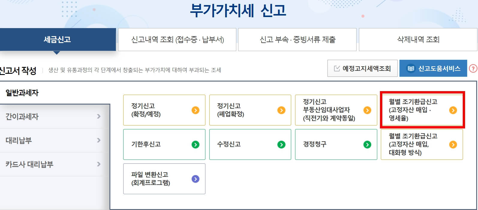 * 1,4,7,10월은 정기신고하는 달이므로 그 외의 달만 월별 조기환급신고 선택하여 신고하면 됩니다.