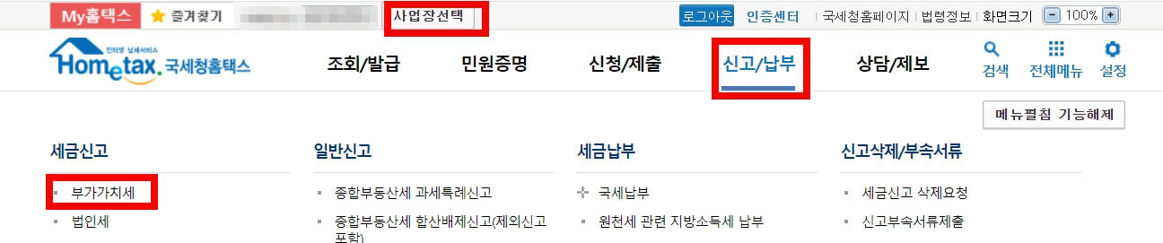 신고/납부 → 세금신고 아래 부가가치세 클릭합니다.
