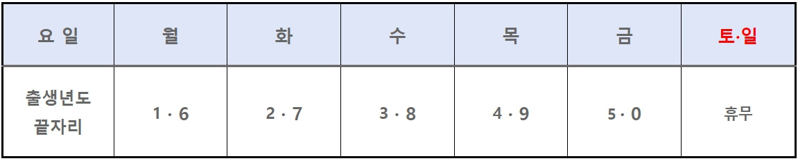 - 금요일: 출생년도 끝자리 5, 0