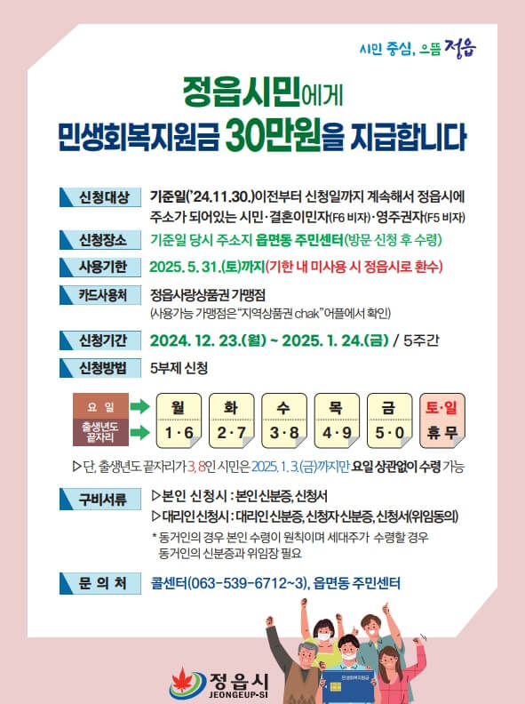 아래에서 정읍시 민생회복지원금 신청 대상, 방법, 일정, 사용처 등 상세한 내용을 확인하여 지금 바로 신청하실 수 있습니다.